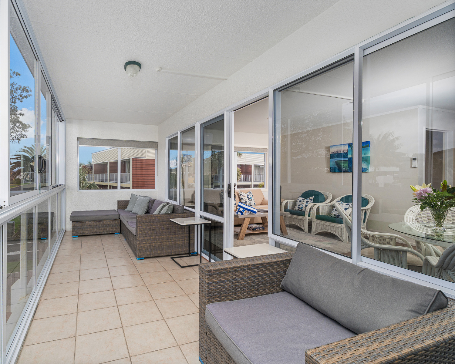 Tucked away from the road for extra peace, this modern apartment features harbour views from its enclosed patio and a large, recently refurbished bathroom